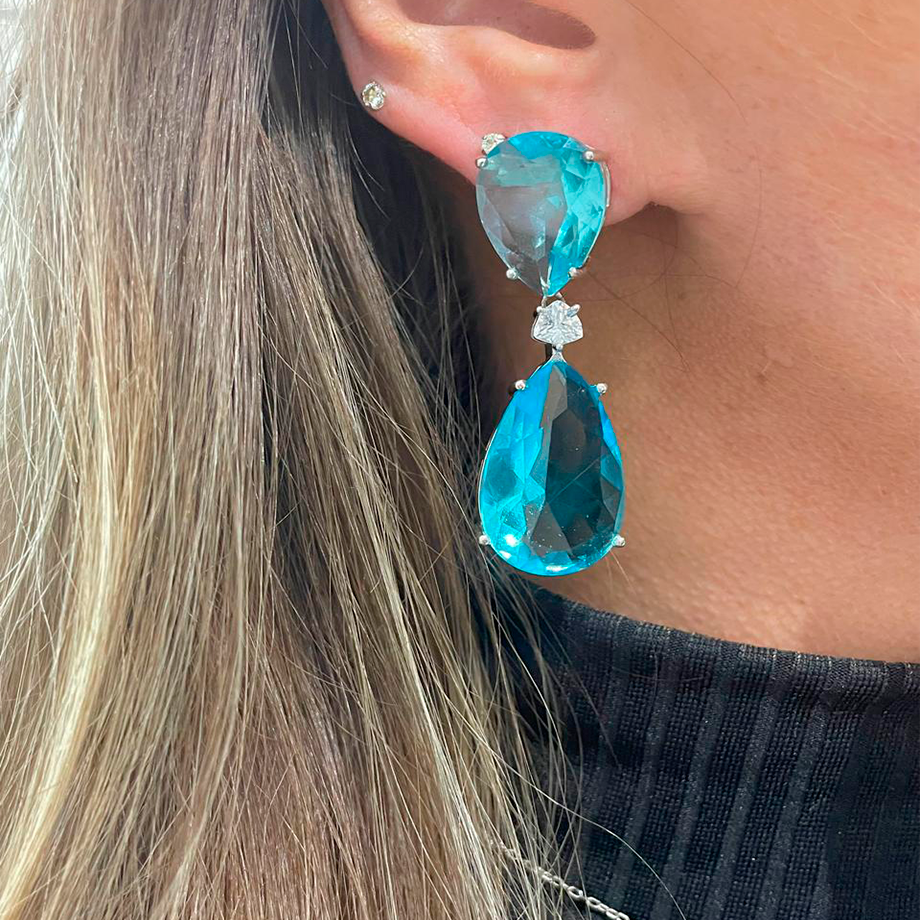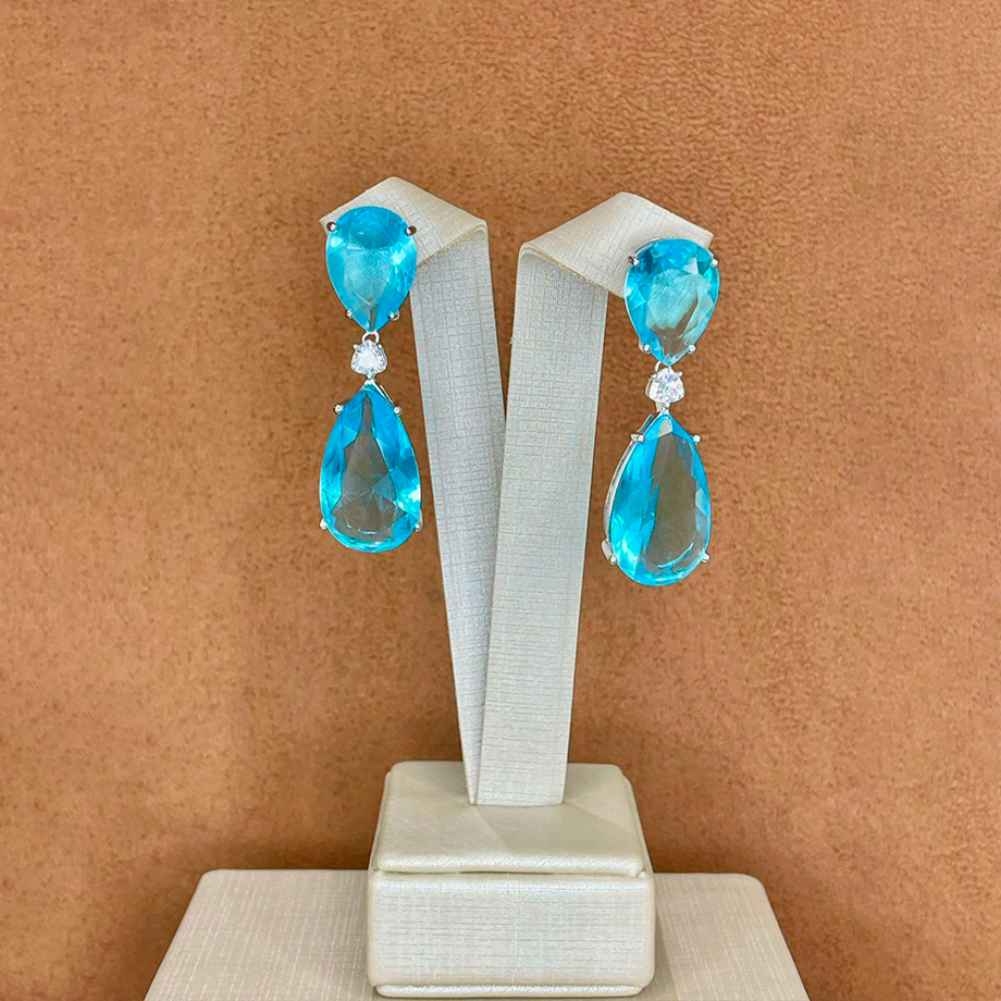 Brinco 2 gotas na Prata 925 com banho ródio branco e cristal na cor água marinha