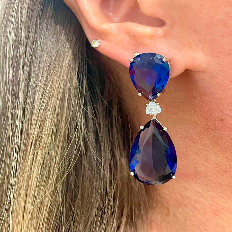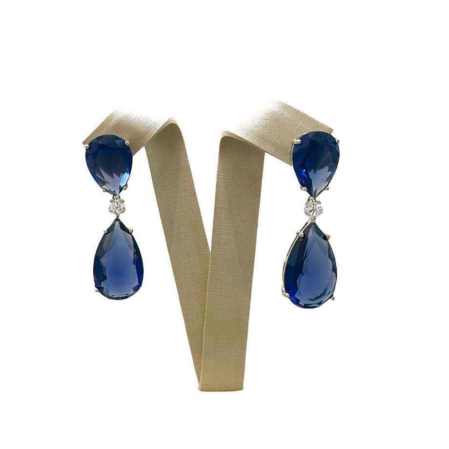 Brinco Gota Grande em Prata 925 com Banho Ródio Branco e Safira